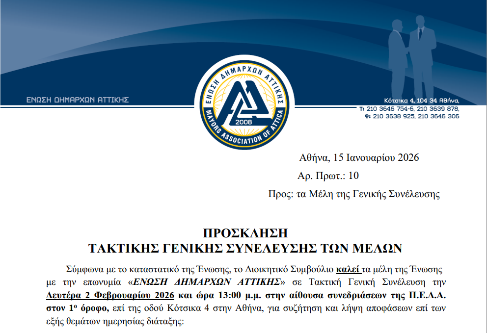 Αθήνα, 15 Ιανουαρίου 2026 Αρ. Πρωτ.: 10 Προς: τα Μέλη της Γενικής Συνέλευσης ΠΡΟΣΚΛΗΣΗ ΤΑΚΤΙΚΗΣ ΓΕΝΙΚΗΣ ΣΥΝΕΛΕΥΣΗΣ ΤΩΝ ΜΕΛΩΝ Σύμφωνα με το καταστατικό της Ένωσης, το Διοικητικό Συμβούλιο καλεί τα μέλη της Ένωσης με