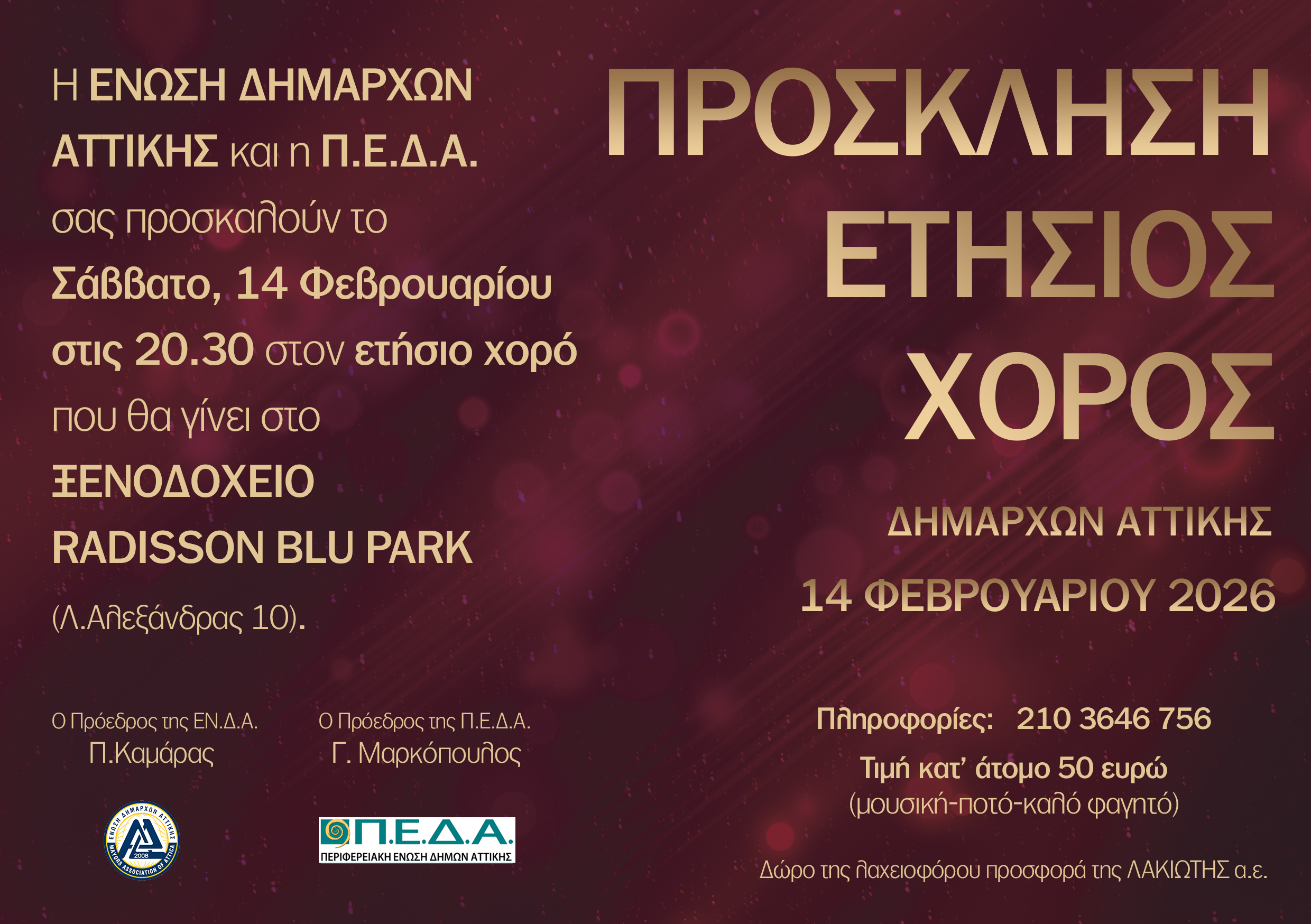 Η Ένωση Δημάρχων Αττικής και η Π.Ε.Δ.Α. σας προσκαλούν στην εκδήλωση «12α ΒΡΑΒΕΙΑ ΑΥΤΟΔΙΟΙΚΗΣΗΣ» που θα γίνει την Δευτέρα 1 Δεκεμβρίου 2025 και ώρα 18.30 (ώρα προσέλευσης 18:00) στο Μέγαρο Μουσικής αίθουσα «Ν. Σκαλκώτας». Θα
