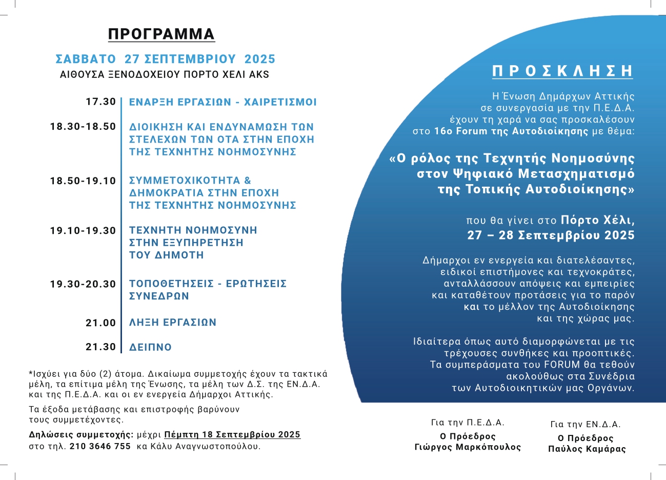 Η Ένωση Δημάρχων Αττικής σε συνεργασία με την  Π.Ε.Δ.Α. έχουν τη χαρά να σας προσκαλέσουν στο 16ο Forum της Αυτοδιοίκησης με θέμα: