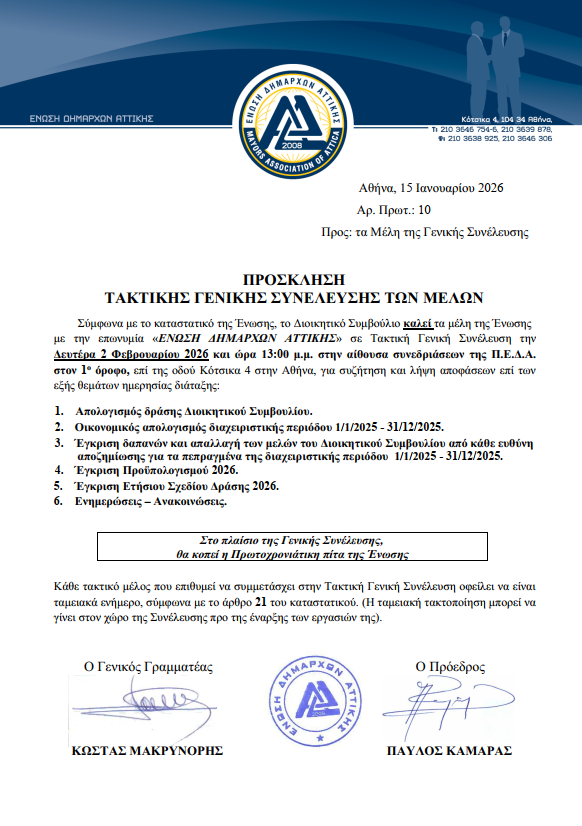 Σύμφωνα με το καταστατικό της Ένωσης, το Διοικητικό Συμβούλιο καλεί τα μέλη της Ένωσης με την επωνυμία «ΕΝΩΣΗ ΔΗΜΑΡΧΩΝ ΑΤΤΙΚΗΣ» σε Τακτική Γενική Συνέλευση την      Δευτέρα 2 Φεβρουαρίου 2026 και ώρα 13:00 μ.μ. στην αίθουσα συνεδριάσεων της Π.Ε.Δ.Α. στον 1ο όροφο, επί της οδού Κότσικα 4 στην Αθήνα, για συζήτηση και λήψη αποφάσεων επί των εξής θεμάτων ημερησίας διάταξης: